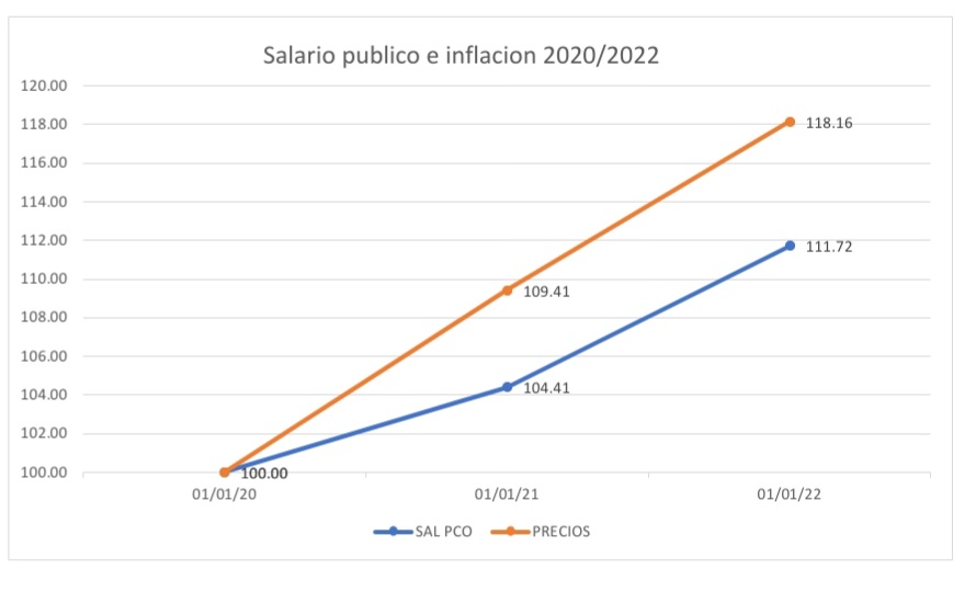 En su segundo ejemplo, explicó que “un docente de primaria o secundaria de grado 4 con 30 horas docentes, que en enero de 2020 percibía 56.999 pesos, perderá en dos años 63.012 pesos”.