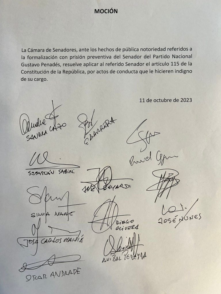 Por su parte, los senadores del partido Nacional solicitaron a los restantes partidos con representación parlamentaria que se aplique el artículo 115 de la Constitución para expulsar al senador Gustavo Penadés.