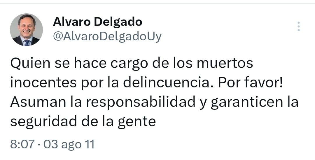 Tomando aquellos datos de los homicidios en 2011 bastaría para comprender que aquel juicio (demagógico y apresurado) del entonces diputado Álvaro Delgado, quedaría corto ante los resultados que viene recogiendo la gestión de su correligionario Heber con la friolera de 256 homicidios acumulados en los primeros 8 meses de este año 2023. Un número significativamente superior a aquellos 199 que lo impulsaron al grito fácil de aquel tuit.