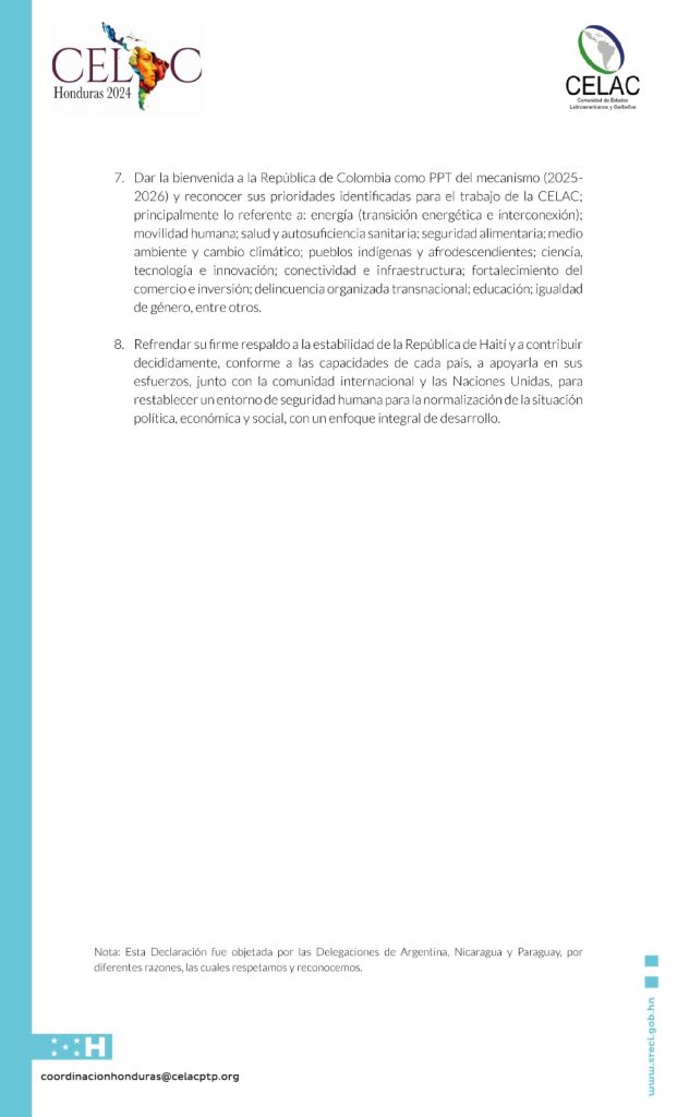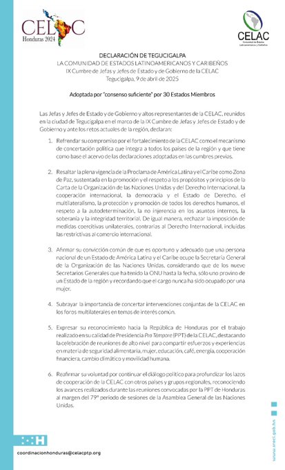 La Declaración de Tegucigalpa ratifica, una vez más, la voluntdad de mantener a la Región como Zona de Paz, en base al “el respeto a los propósitos y principios de la Carta de la Organización de las Naciones Unidas y del Derecho Internacional, la cooperación internacional, la democracia y el Estado de Derecho, el multilateralismo, la protección y promoción de todos los derechos humanos, el respeto a la autodeterminación, la no injerencia en los asuntos internos, la soberanía y la integridad territorial”.