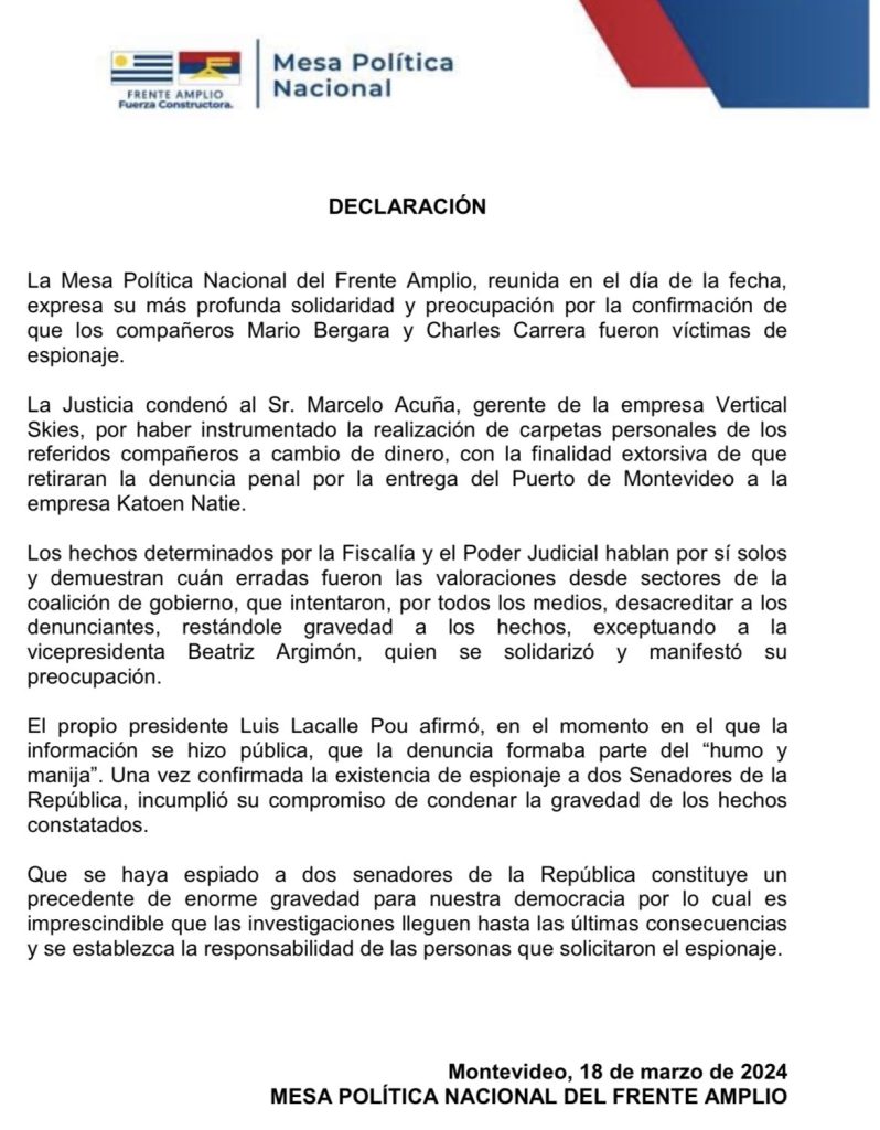 La Mesa Política Nacional del Frente Amplio (FA) hizo público un comunicado en el que expresó “su más profunda solidaridad” y “preocupación por la confirmación de que los senadores Mario Bergara y Charles Carrera fueron víctimas de espionaje”.