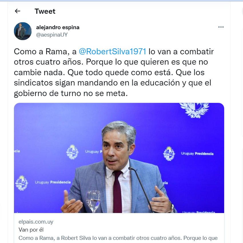 “No se promueve el debate profundo con docentes porque llevaría mucho tiempo y @RobertSilva1971 ha decidido que la transformación educativa sea su plataforma electoral. Tal es así que acomodó a sus dirigentes en puestos de comunicación, generando un gasto extra a la Anep”, se denuncia en el primer tuit de la organización sindical.