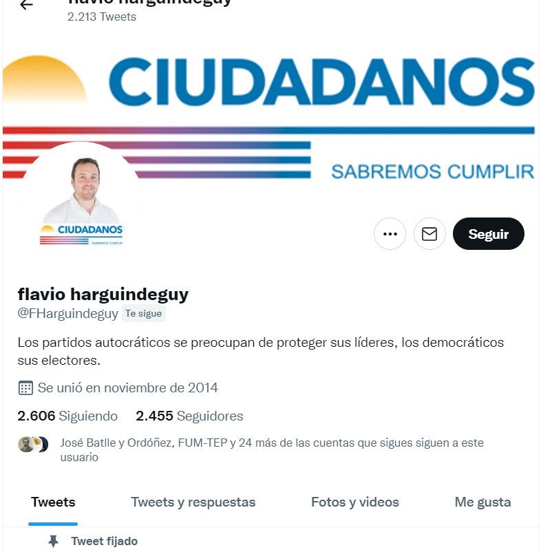 “¿Hay más? Siempre hay más”, ironiza el tuit, “tenemos también el caso de Flavio Harguindeguy. Como podemos ver, militante de Ciudadanos, @PartidoColorado” y se presenta una imagen que prueba lo anterior.