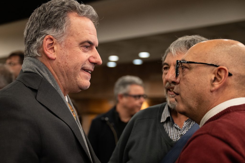 Yamandú Orsi y Marcelo Abdala durante el lanzamiento del diálogo social en el Auditorio del Sodre Nelly Goitiño. Foto: Santiago Mazzarovich / adhocFOTOS.