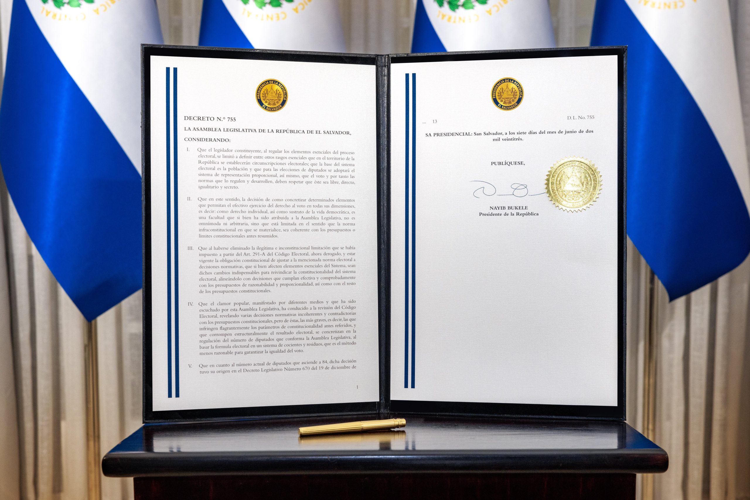 Las modificaciones al Código Electoral fueron alabadas por el presidente Bukele, quien en su cuenta de Twitter escribió: «Acabo de firmar la Reforma al Código Electoral, que reduce el número de diputados de 84 a 60 (como era antes de los falsos acuerdos de paz) y elimina a los diputados por residuo, dejando únicamente los diputados asignados por cantidad de votos».