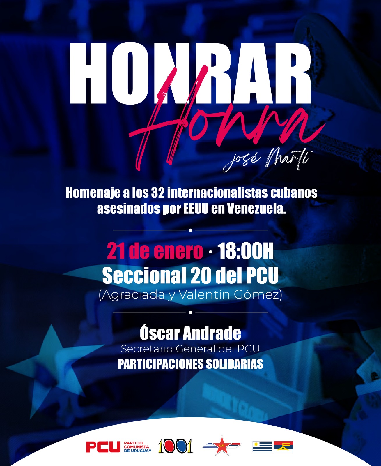 Este miércoles 21 de enero, a las 18 horas, en el histórico local del Seccional 20, el Partido Comunista de Uruguay (PCU) y la Unión de la Juventud Comunista (UJC) convocan a un homenaje a los 32 internacionalistas cubanos asesinados por EEUU en la agresión a Venezuela el pasado 3 de enero.
