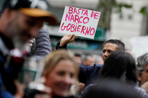 20231113 / Javier Calvelo / adhocFOTOS / URUGUAY / MONTEVIDEO / El PIT-CNT, con el apoyo en las ultimas horas del Frente Amplio, realiza una movilización "en defensa de la democracia y contra la corrupción", en el marco de los escándalos entorno al caso Marset. En la foto: Protesta y movilización "en defensa de la democracia y contra la corrupción" por la avenida 18 de Julio en Montevideo. Foto: Javier Calvelo / adhocFOTOS
