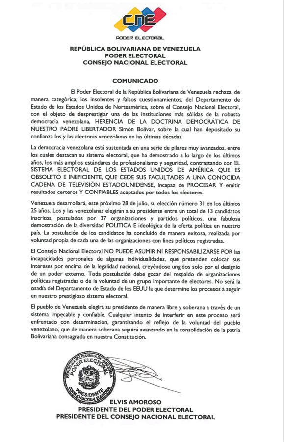 Las declaraciones del Departamento de Estado estadounidense con relación al proceso electoral venezolano a realizarse el próximo 28 de julio, fueron enfáticamente rechazadas por el Consejo Nacional Electoral de Venezuela (CNE).