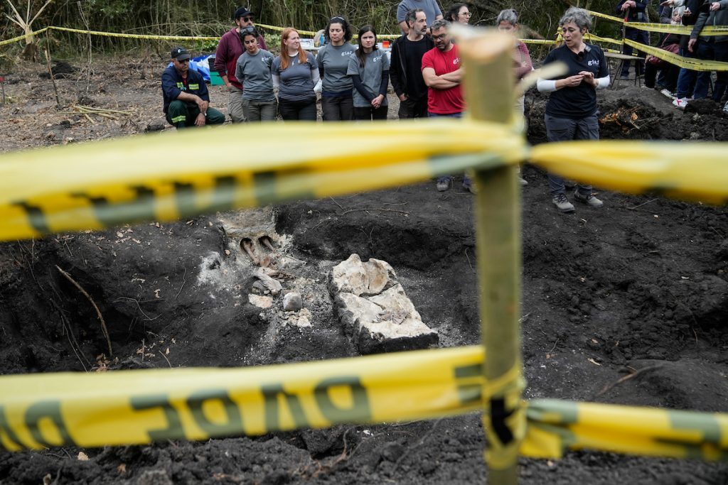 La jefa del equipo de antropólogos, Alicia Lusiardo, informó detalles de la tumba encontrada. “La extracción de este cuerpo y la estructura que lo envolvía insumió tres jornadas laborales. Lo que podemos compartirles en relación a la caracterización de la fosa tiene que ver con que esta fue excavada de manera regular configurando un rectángulo con bordes redondeados. las medidas de esta fosa excavada son de 2,15 de longitud por 0,5 de ancho y 1 metro de profundidad. Adentro de esta fosa es que se ubica esta estructura con este cuerpo que tenía una orientación con el cráneo al sureste y los pies al noroeste. Las medidas de la estructura son de 2 metros por 0,5 de ancho y 0,5 de profundidad y en relación a cómo estaba compuesta esta estructura al fondo, o lo primero que se colocó en la fosa fue una capa de cal. Es decir, no se trata de una estructura homogénea que envuelve al cuerpo, sino que está compuesta por distintas capas de distintos materiales. Una primera capa más profunda de cal por encima del cuerpo, por encima una capa de cal y pedregullo y por encima de esta una cal de arena cemento y pedregullo y por encima otra capa de cal y arena. Por supuesto esto tapado por 50 centímetros de tierra”.