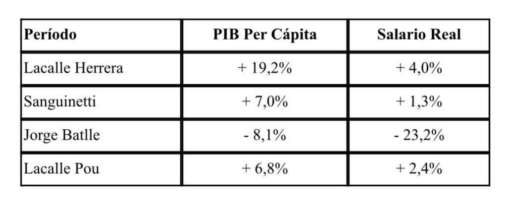 En los gobiernos del Frente Amplio el salario real creció al ritmo de la economía (en algunos períodos incluso por encima) de manera que mejora la distribución entre trabajo y capital. También cabe señalar que en los gobiernos del Frente Amplio el crecimiento del salario ha sido constante de manera que no puede atribuirse un criterio electoralista de “ajustar” a la baja primero y “abrir la canilla” al final, como sí ha ocurrido en los últimos gobiernos blanqui colorados.