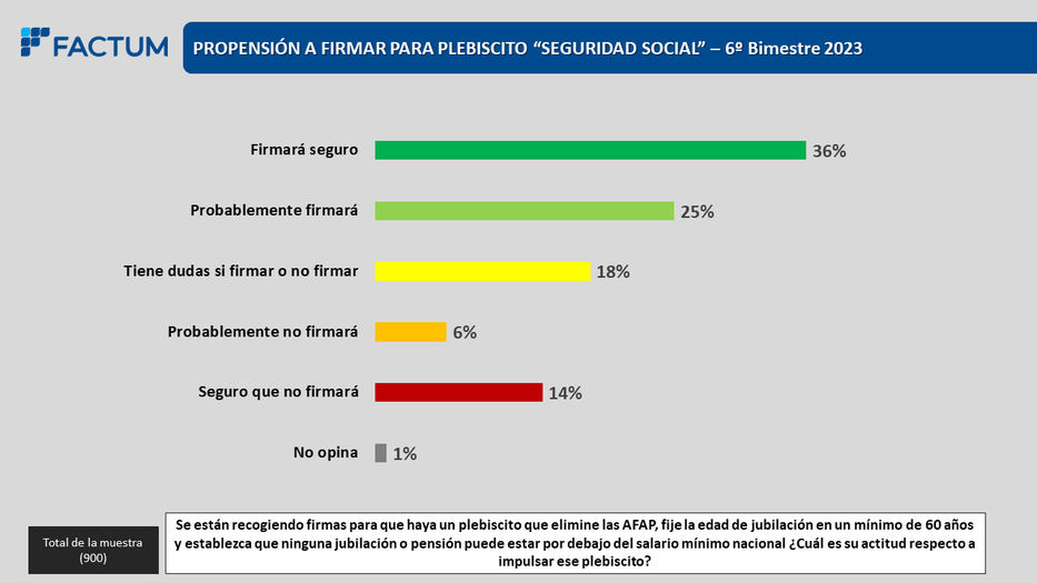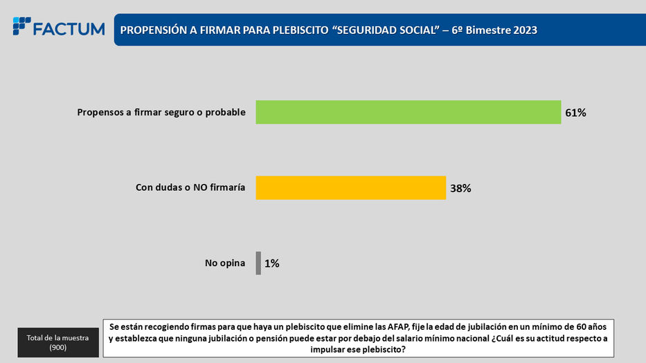 Una encuesta realizada por Factum reveló que el 61% de las personas encuestadas se manifestó “propensa a firmar” por el plebiscito que impulsa el Pit-Cnt, con el apoyo de varias organizaciones sociales y algunos sectores del Frente Amplio (FA).
