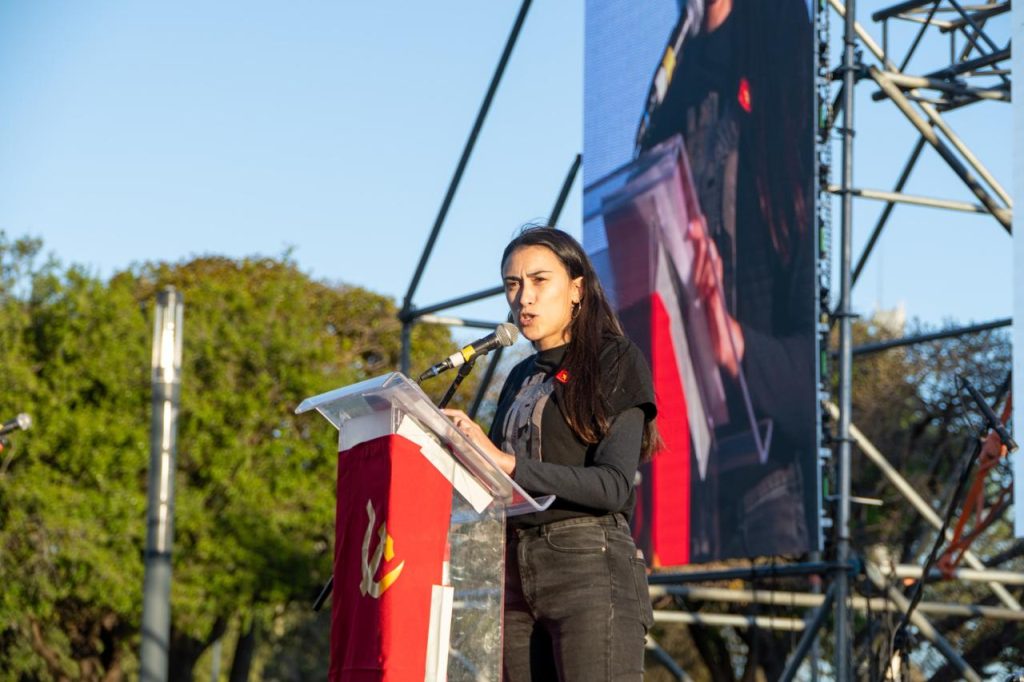 La voz de la UJC también estuvo presente en el escenario del 105 aniversario en la voz de la secretaria general de Montevideo y diputada Natalia Díaz.