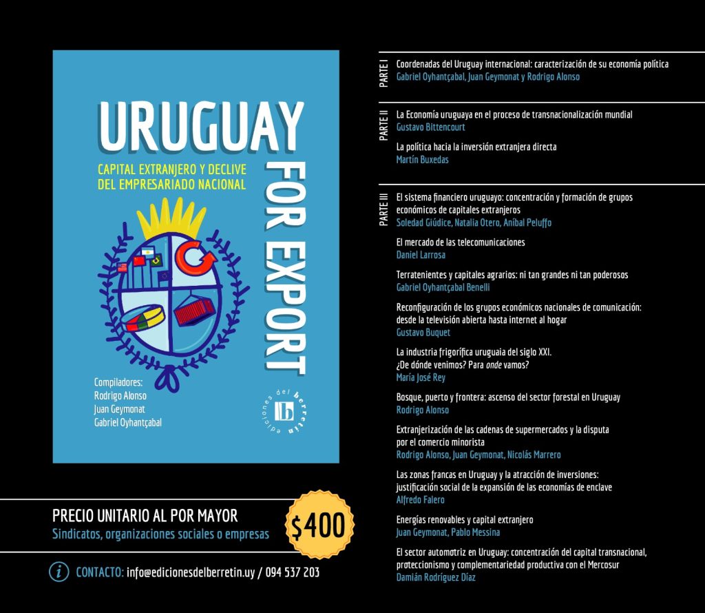 El pasado 14 de octubre, en el marco de la Feria Internacional de Libro en la Intendencia de Montevideo, se presentó el libro Uruguay for export. Capital extranjero y declive del empresariado nacional (Ediciones del Berretin), coordinado y compilado por Rodrigo Alonso, Juan Geymonat y Gabriel Oyhantçabal.
